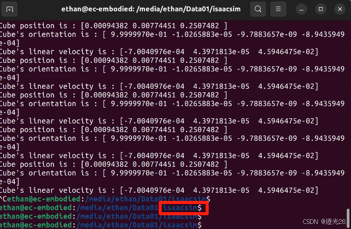 在模拟过程中,每执行一个物理步长(Physics Step),就打印出立方体的世界坐标位姿和速度。