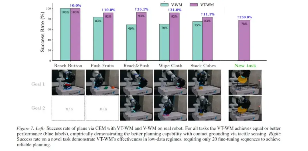 在真实机器人零样本实验中,VT-WM 将高接触任务规划成功率最高提升35%,还能仅靠少量演示数据快速适配全新任务,为机器人高接触操作提供了更可靠的多模态解决方案。