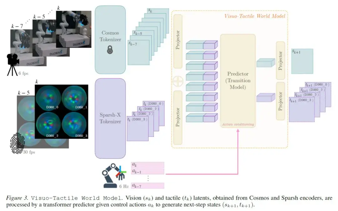 VT-WM的训练围绕视觉、触觉、动作三类输入展开,充分考虑了双模态的信号特性,让模型能精准捕捉视觉 - 触觉融合的动力学规律: