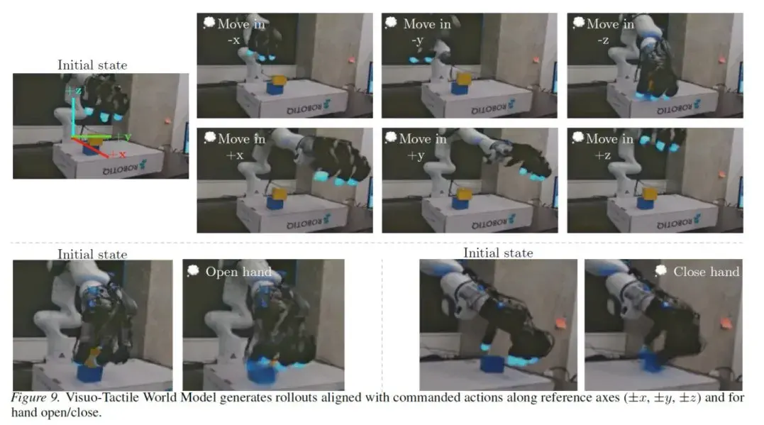 实验结果显示:VT-WM 能够生成与指令动作一致、连贯的推演结果 —— 沿各坐标轴的平移会使想象中的末端执行器产生方向一致的位移(见图中参考坐标系),而手爪开合指令会使手指姿态产生相应变化。
