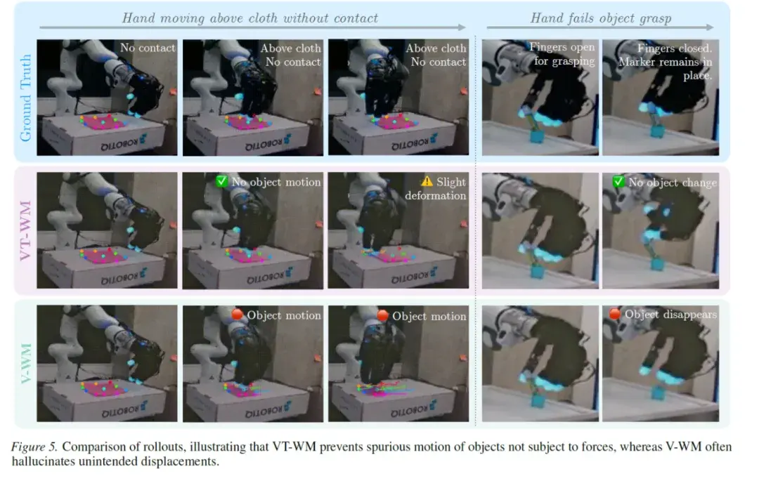 纯视觉世界模型的局限在于,单靠视觉难以精确刻画物理接触关系。VT-WM通过融合指尖触觉与外部视觉,将模型的“想象”锚定在接触物理规律上,能够在遮挡场景下维持对物体状态的稳定估计,使预测更贴合真实物理法则。
