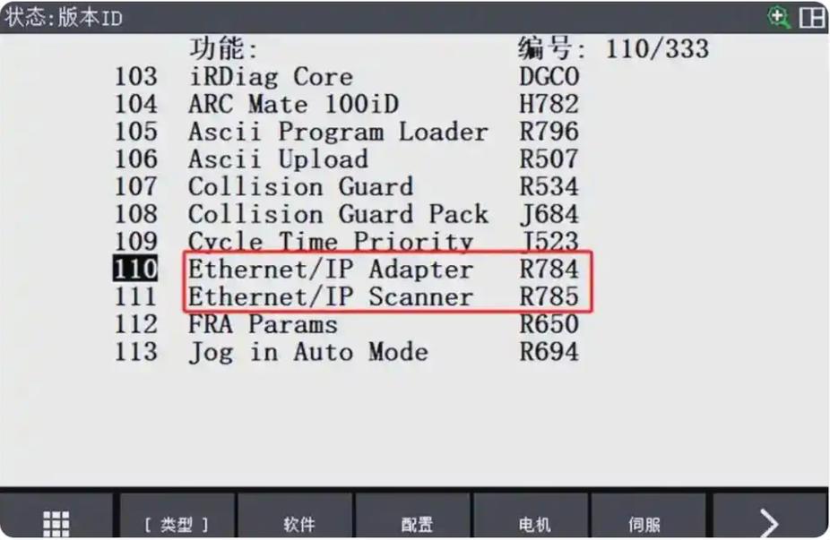 我走到示教器前,按下 MENU 键,进入 状态 (Status) -> 版本ID (Version ID)。心里默念着:千万要有EtherNet/IP选项啊!