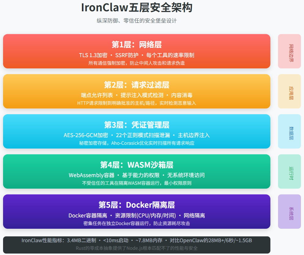 | IronClaw | Rust | - | 五层安全纵深防御 | 高安全环境 |