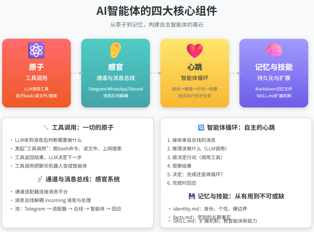 五大组件:AgentLoop(硬上限20次迭代)、ContextBuilder、MessageBus、SkillsLoader、MemoryStore。