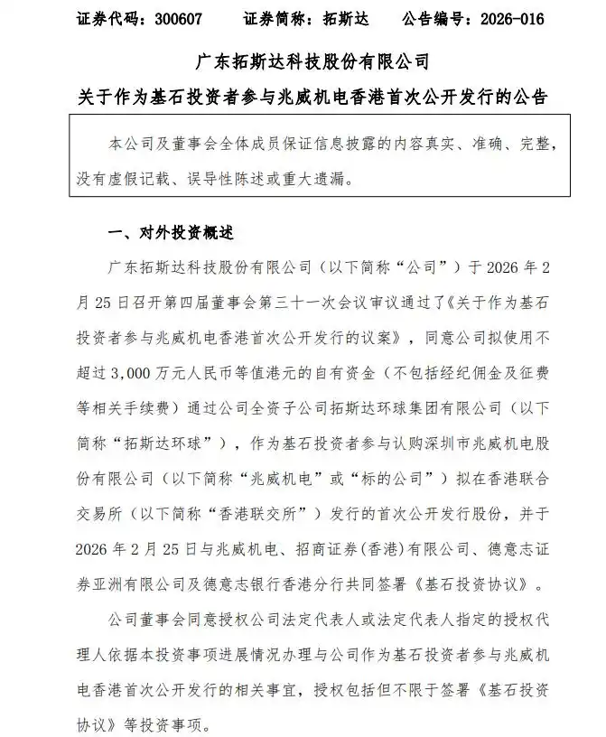 拓斯达近年来向具身智能领域延伸布局,2025年9月和2026年1月分别推出轮式人形机器人"小拓"及四足机器人"星仔"。此次基石投资兆威机电,旨在推动其具身智能产业发展,促进双方长期合作关系,展开深度战略合作。兆威机电预计于2026年3月9日在港交所主板上市。