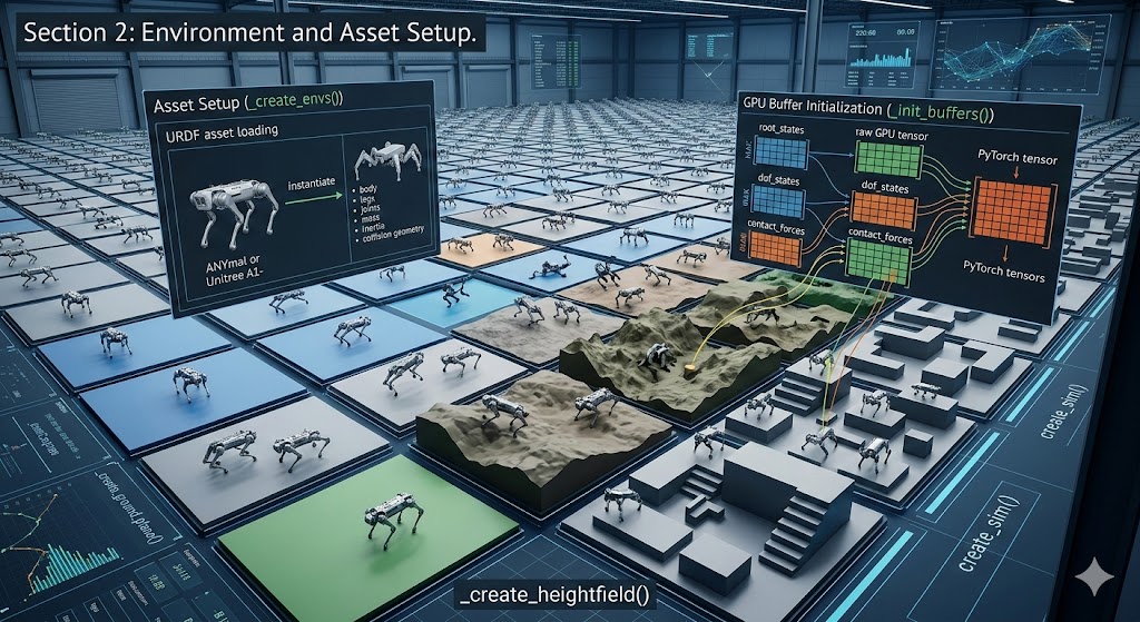 今天,我们将聚焦框架的第二大核心模块:环境与资产初始化 (Environment & Asset Setup)。在基于 Isaac Gym 等 GPU 加速的仿真器中,高效的初始化和内存预分配是实现几万帧/秒极速训练的基础。