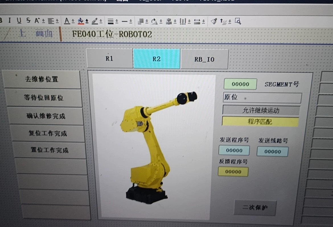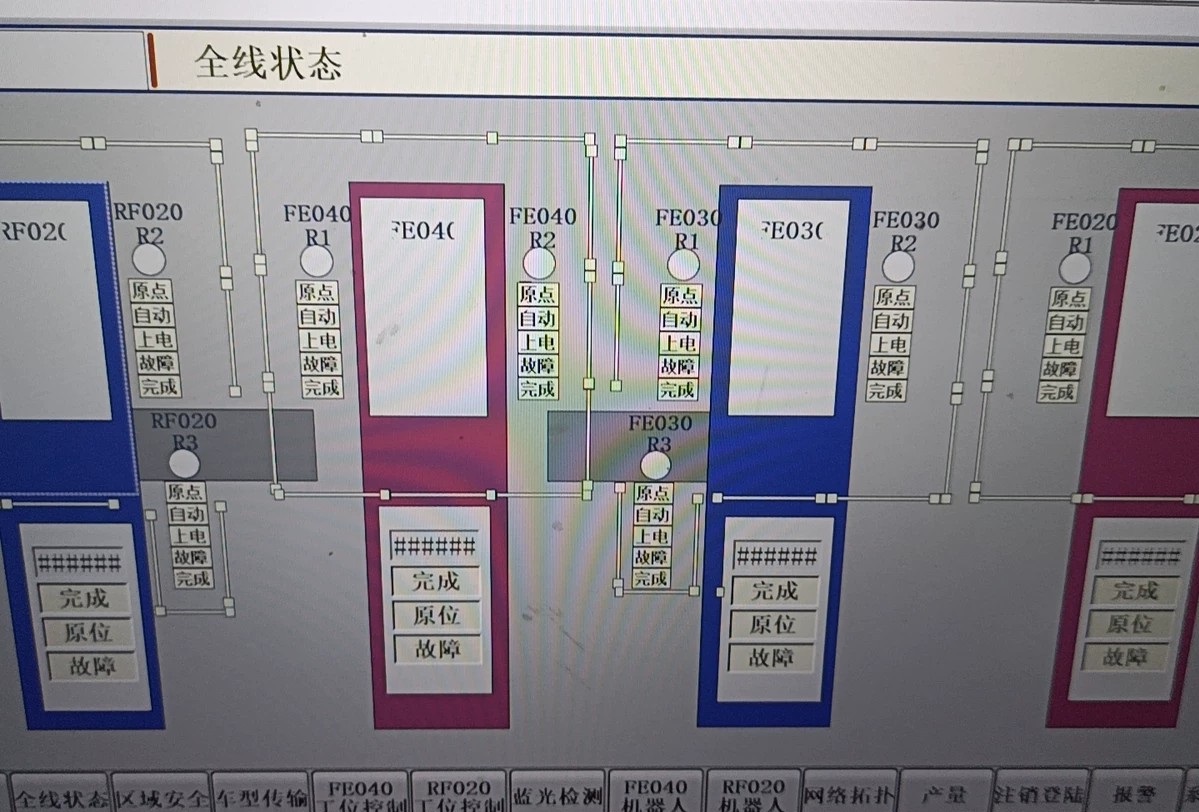 通讯配置有讲究,Profinet网络拓扑做成了环形冗余。重点说下机器人通讯的骚操作——每个Fanuc R-30iB控制器都分配了32字节的IO域。举个例子,控制第3台机器人的输出区: