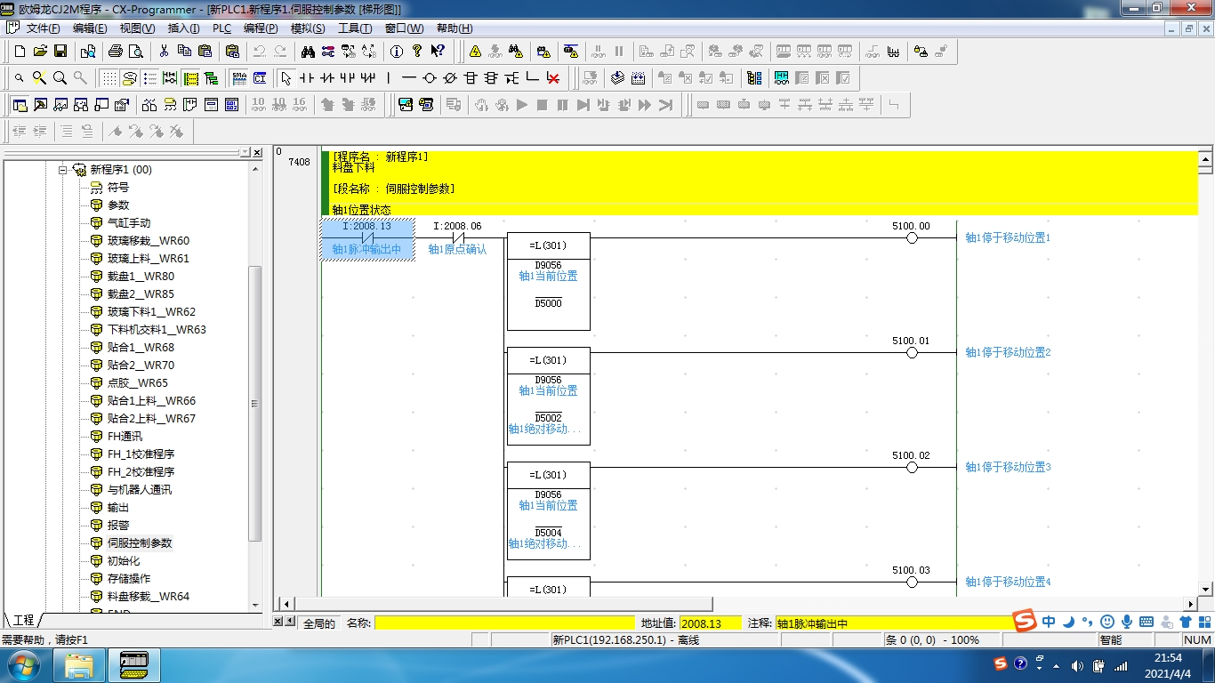 欧姆龙, PLC CJ2M标准程序,一共控制12个伺服电机,气缸若干,包含轴点动,回零,相对与绝对定位,整个项目的模块都有:主控程序,复位程序,手动,生产计数,只要弄明白这个程序,就可以非常了解整个项目的程序如何去编写,从哪里开始下手,可提供程序问题解答,程序流程清晰明了;程序还有与机器人通讯,包含有触摸屏与电路图