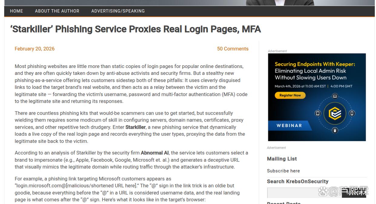 “Starkiller”钓鱼服务的出现,标志着网络钓鱼攻击已从简单的社会工程学欺诈演变为高技术含量的实时中间人攻击。通过利用URL标准的特性、搭建动态反向代理以及实时透传MFA挑战,攻击者成功突破了传统基于静态特征和多因素认证的防御防线。这种攻击模式不仅降低了攻击者的技术门槛,更极大地提高了攻击的成功率和隐蔽性。