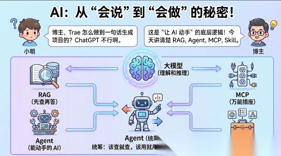 用 Trae 输入一句话就能生成整个项目,Cursor 能 @ 文件、@ 网页——这些「能动手」的 AI 和只会聊天的 ChatGPT 有啥不同?背后是一套从 RAG、MCP 到 Agent、Skill 的底层逻辑。今天用对话帮你讲清楚。