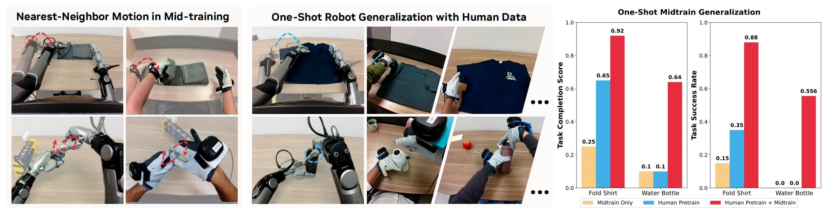 - 相比之下,Pretrain + Midtrain 模型在Fold Shirt 任务上取得0.88 的成功率,在Unscrewing Water Bottles 任务上取得0.55 的成功率,展示了强大的小样本泛化能力