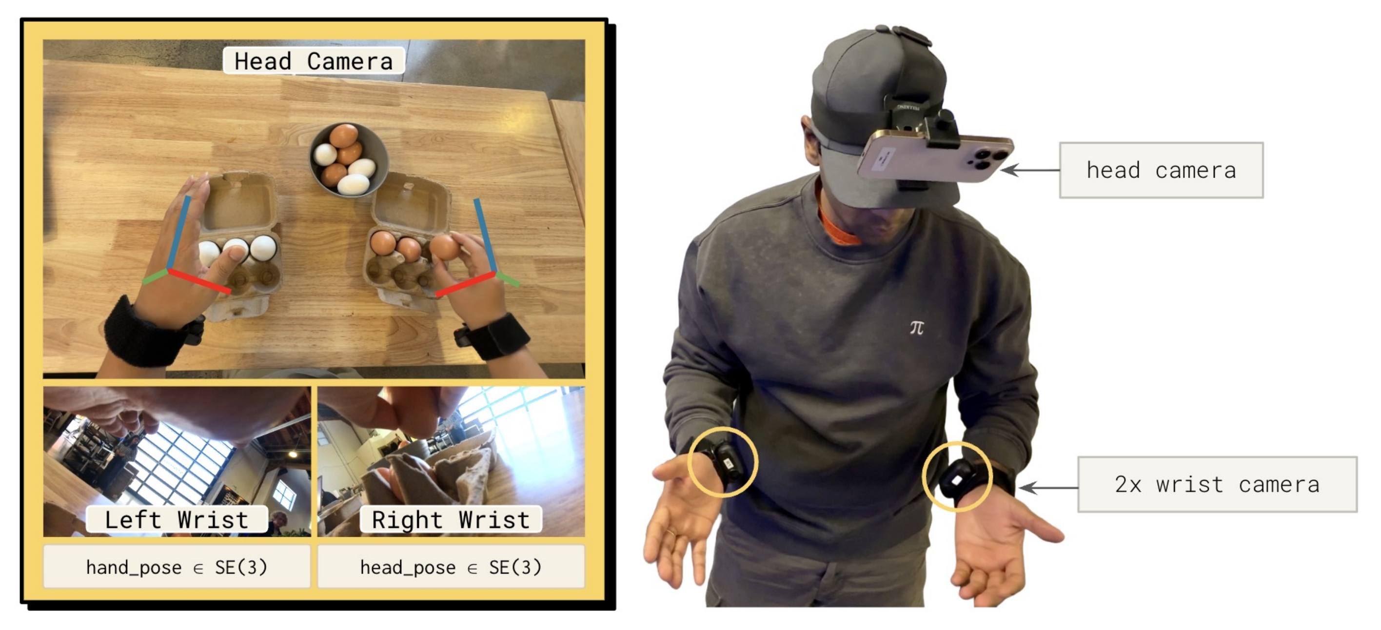 作者使用三台 RGB 相机:一台头戴式相机,提供与人类视频一致的自我中心第一人称视角;以及两台安装在每只手腕内侧、面向手掌的手腕相机,用于捕捉近距离的手-物体交互,并提供对精细灵巧操作至关重要的细致视觉反馈