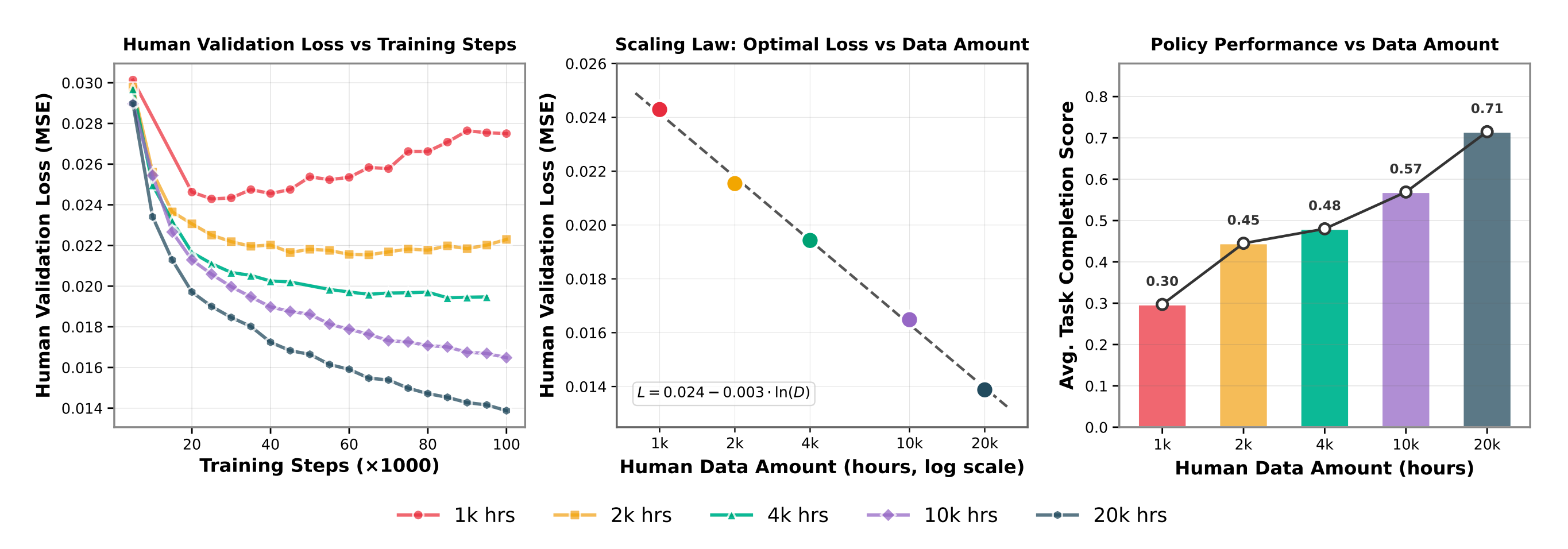 - 使用较小数据集(1k–2k小时)训练的模型在初期会降低验证损失,但随后会出现损失趋于平稳甚至升高的情况,这表明模型对有限的行为多样性产生了过拟合