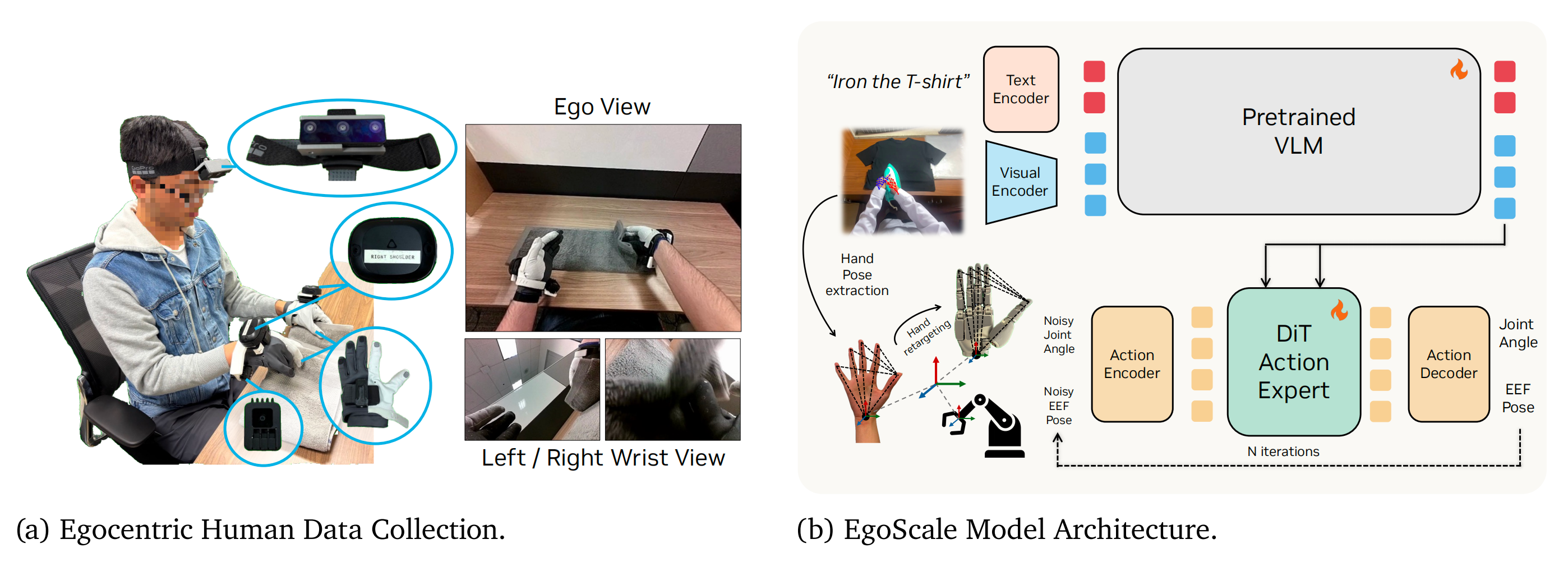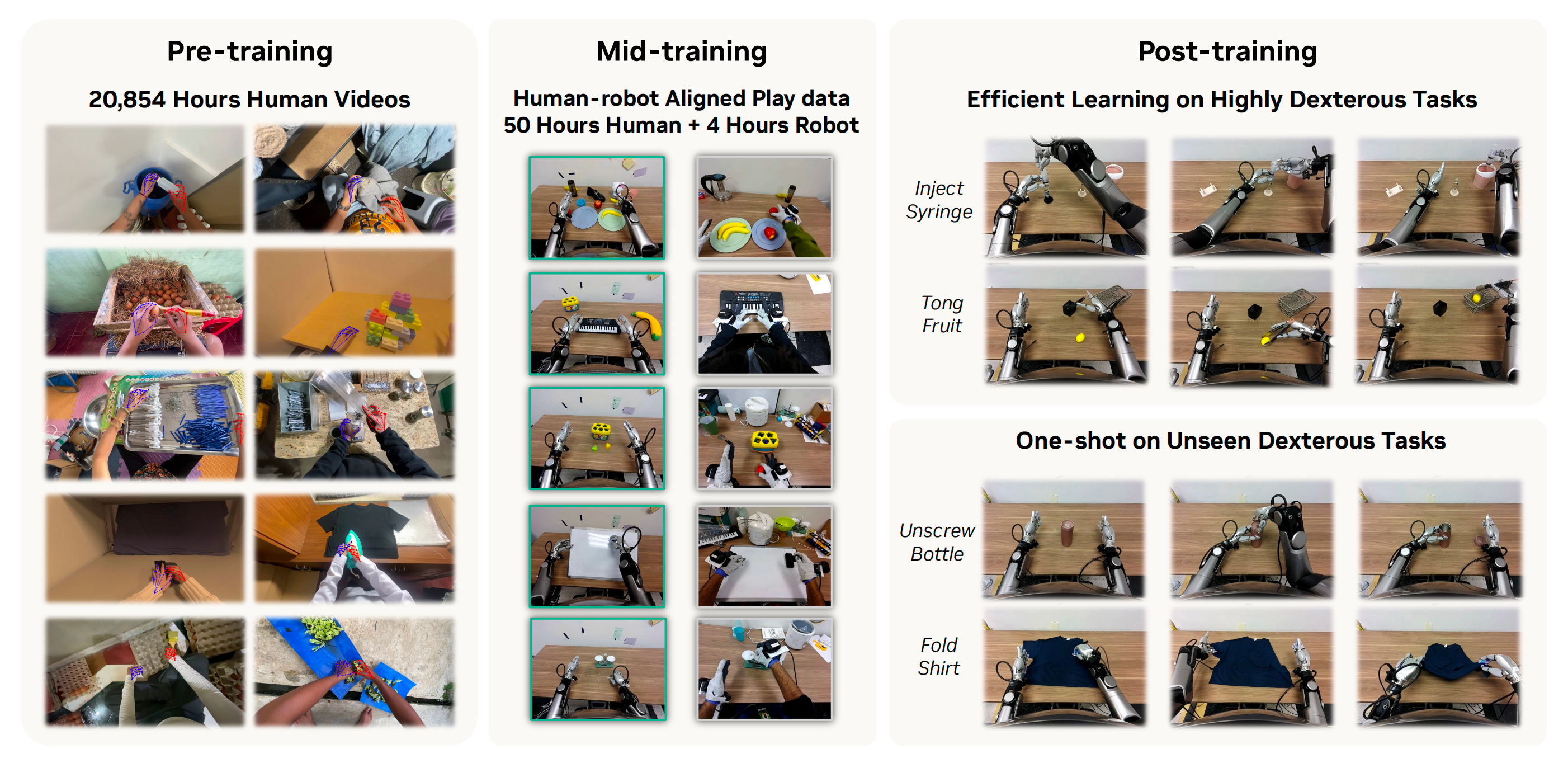 - 首先,在 20,854 小时的人类自视角视频上,利用手腕运动和重定向的灵巧手动作预训练一种基于流的视觉-语言-动作(VLA)策略