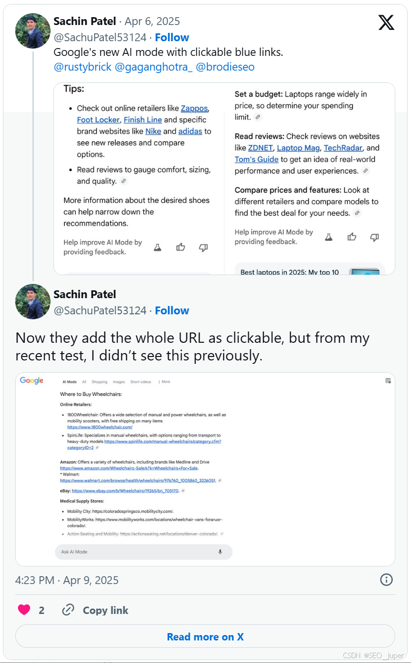 AI模式的答案包含更多内联链接,为用户提供了多种探索主答案之外内容的方式
