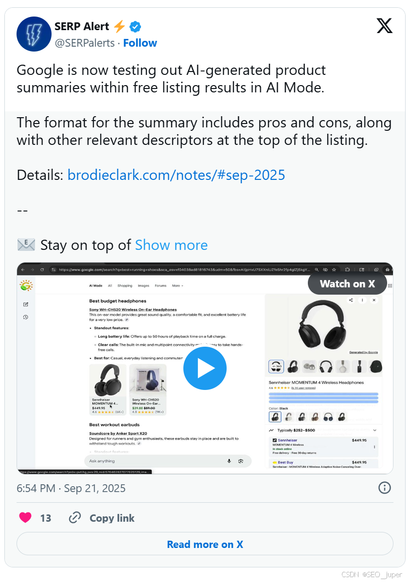 你现在可以在AI模式的产品列表面板中测试AI生成的产品摘要。在 AI 模式中点击产品后,右侧面板会显示动态摘要,列出主要优缺点和描述词。