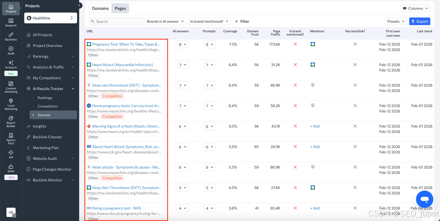 跟踪谷歌AI模式结果中对你品牌或网站链接的每次提及。看看你在重要查询中的可见度(即使你的网站没有直接链接)。