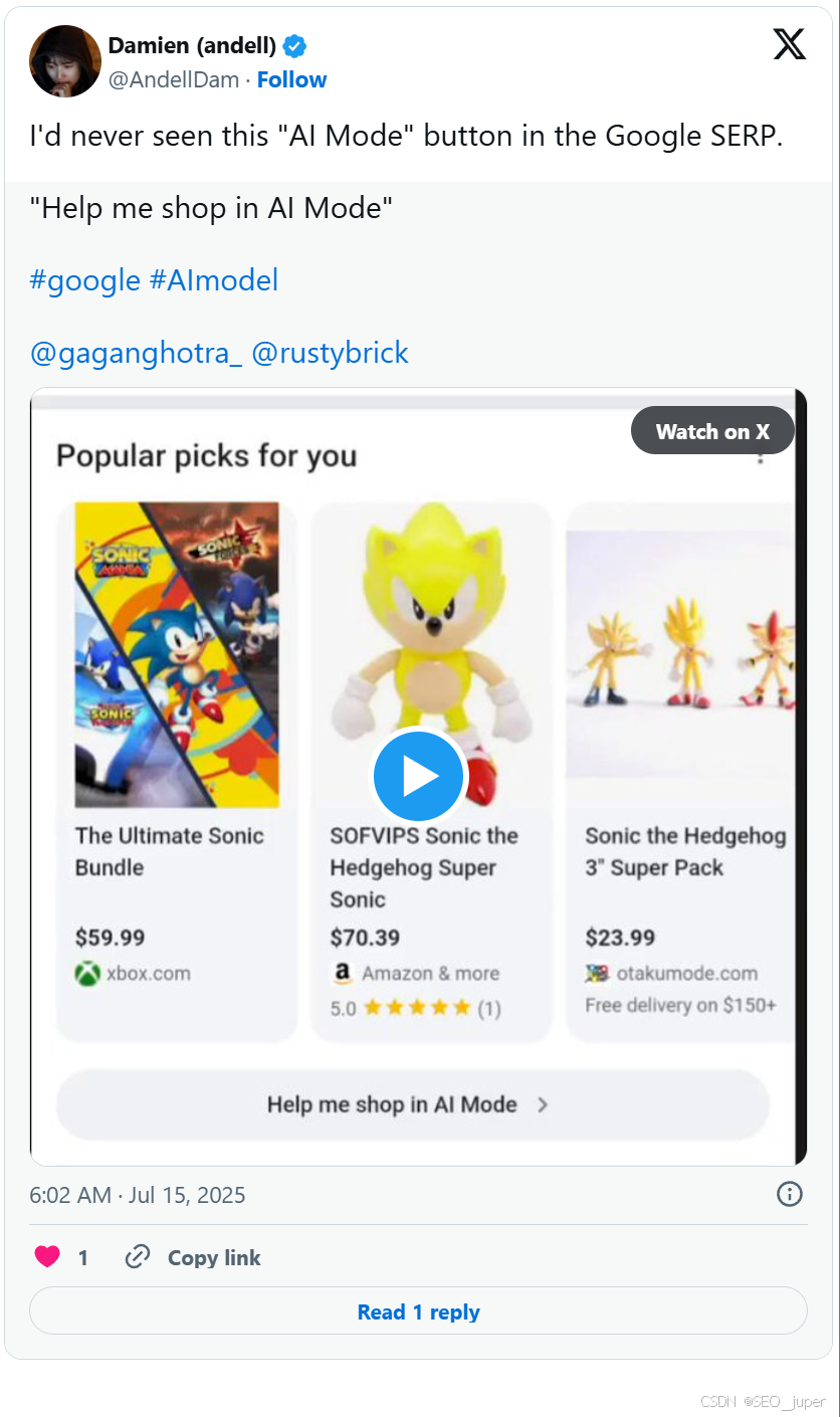 此外,你现在可以在搜索中直接看到一个新的“帮助我以AI模式购物”按钮,引导用户进入一个由AI驱动的购物界面。点击后,它会启动一个对话式体验,根据用户的需求、偏好和查询上下文推荐产品。