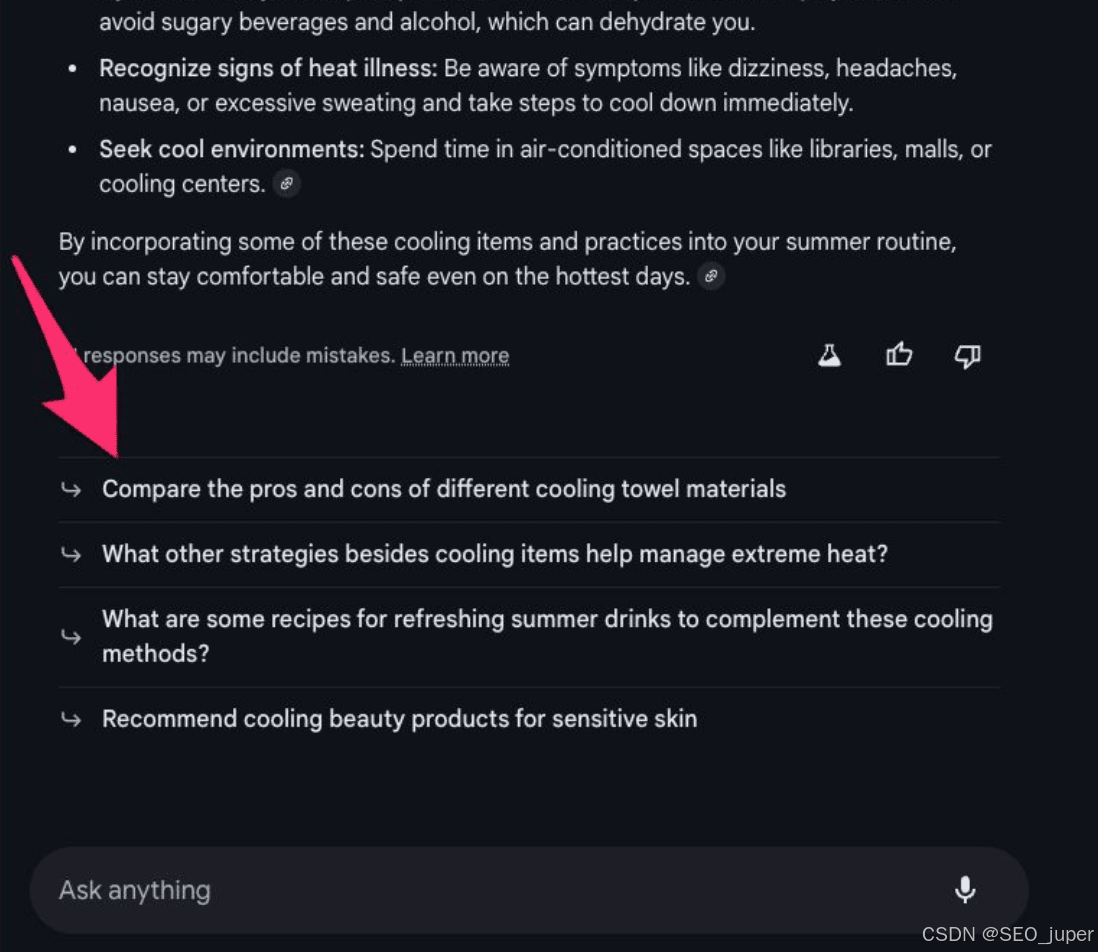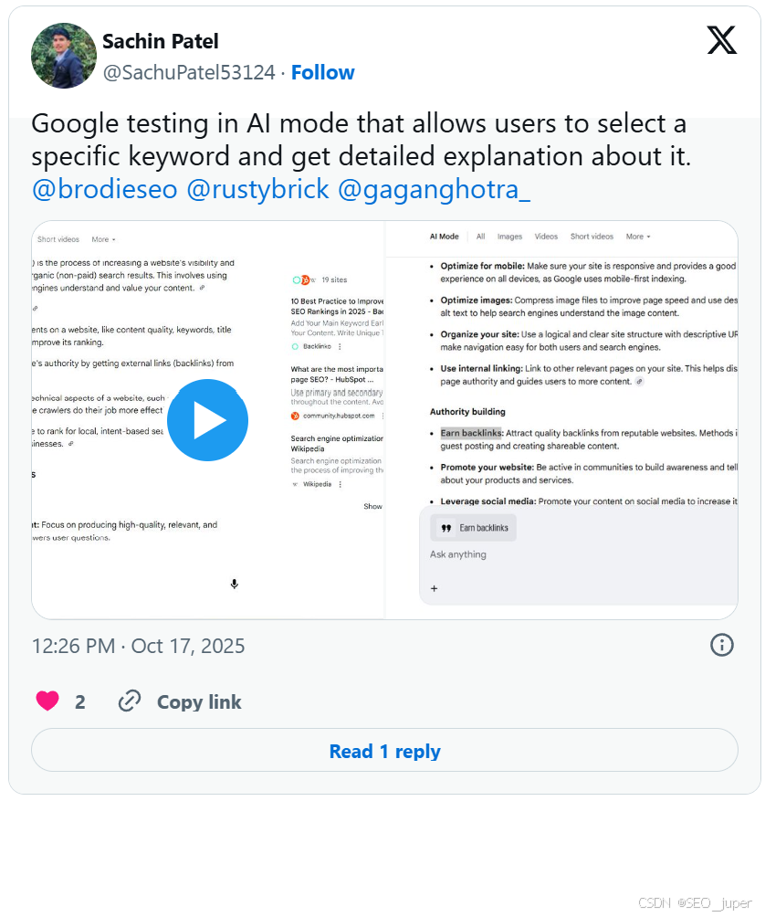 另一个AI模式实验允许用户高亮部分回复,并对所选文本提出后续问题。
