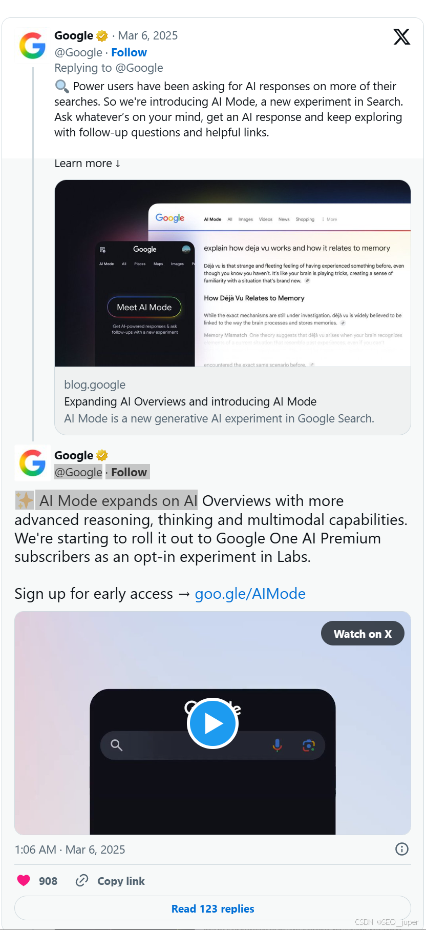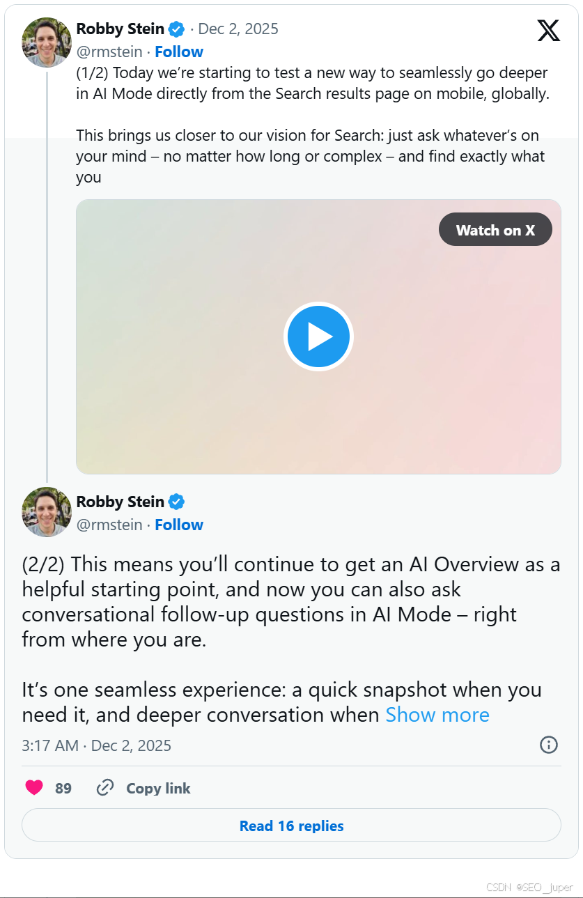随后,谷歌开始尝试整合AI模式和AI概览的界面,打造更统一的AI体验。