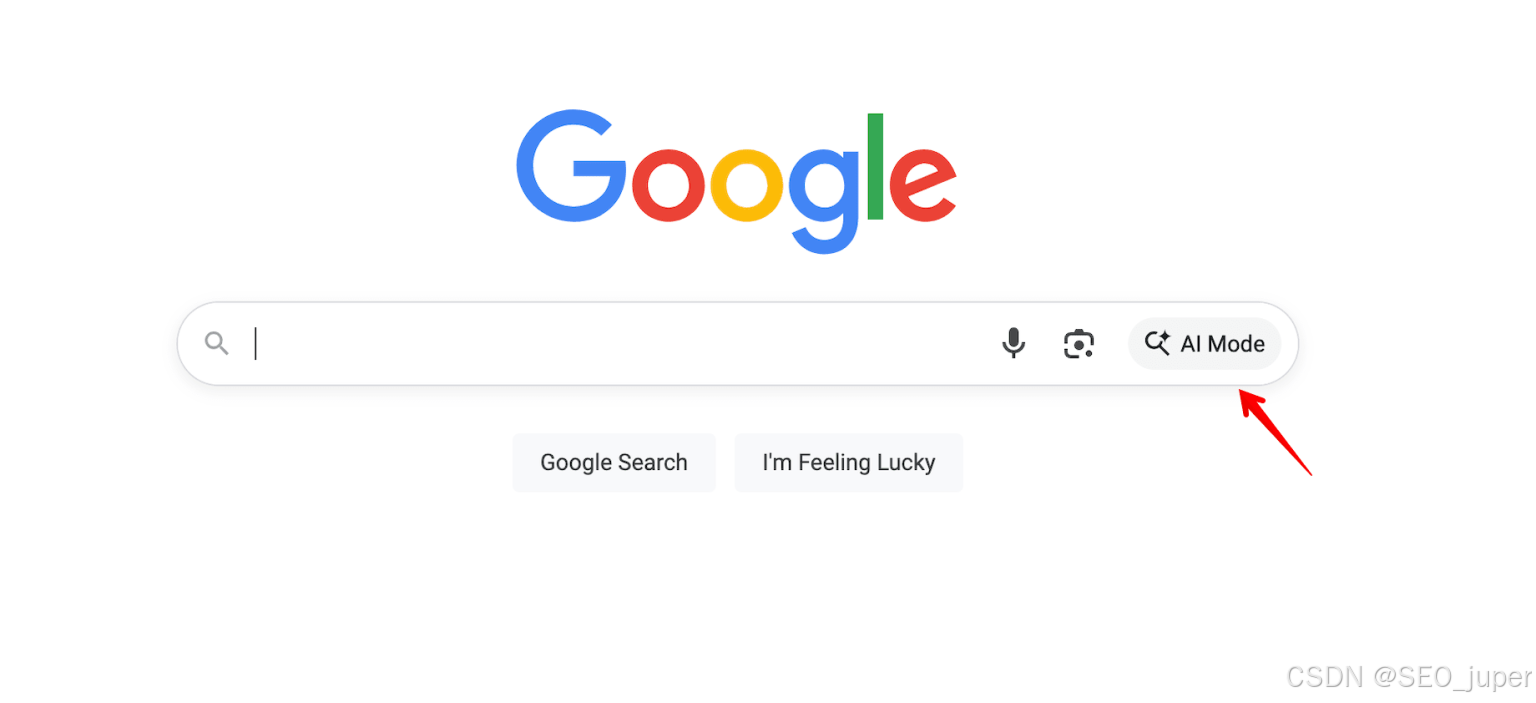 AI模式按钮现在直接集成到谷歌首页搜索栏中。一个小提示邀请用户在(或代替)进行标准搜索前进入AI体验。
