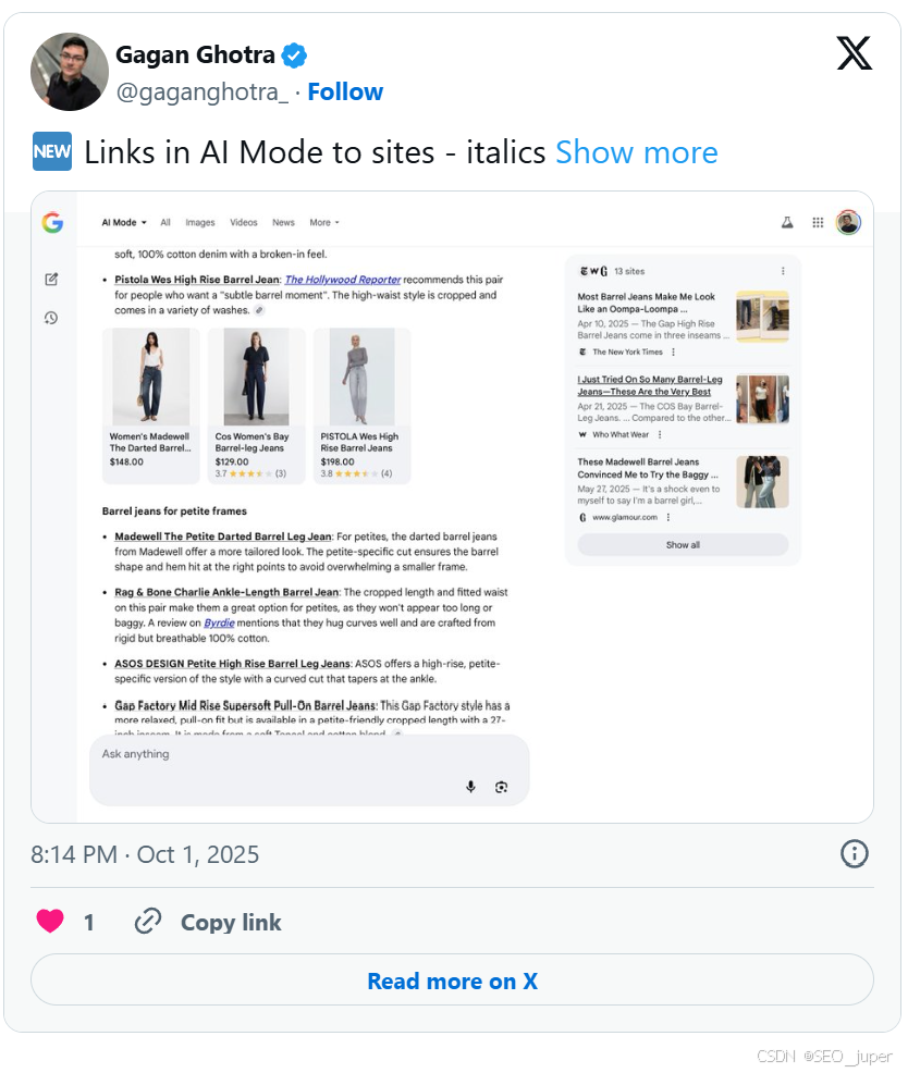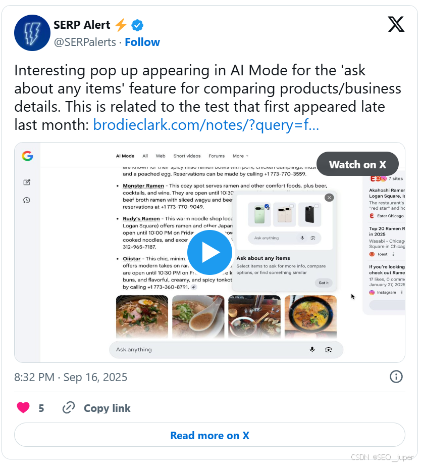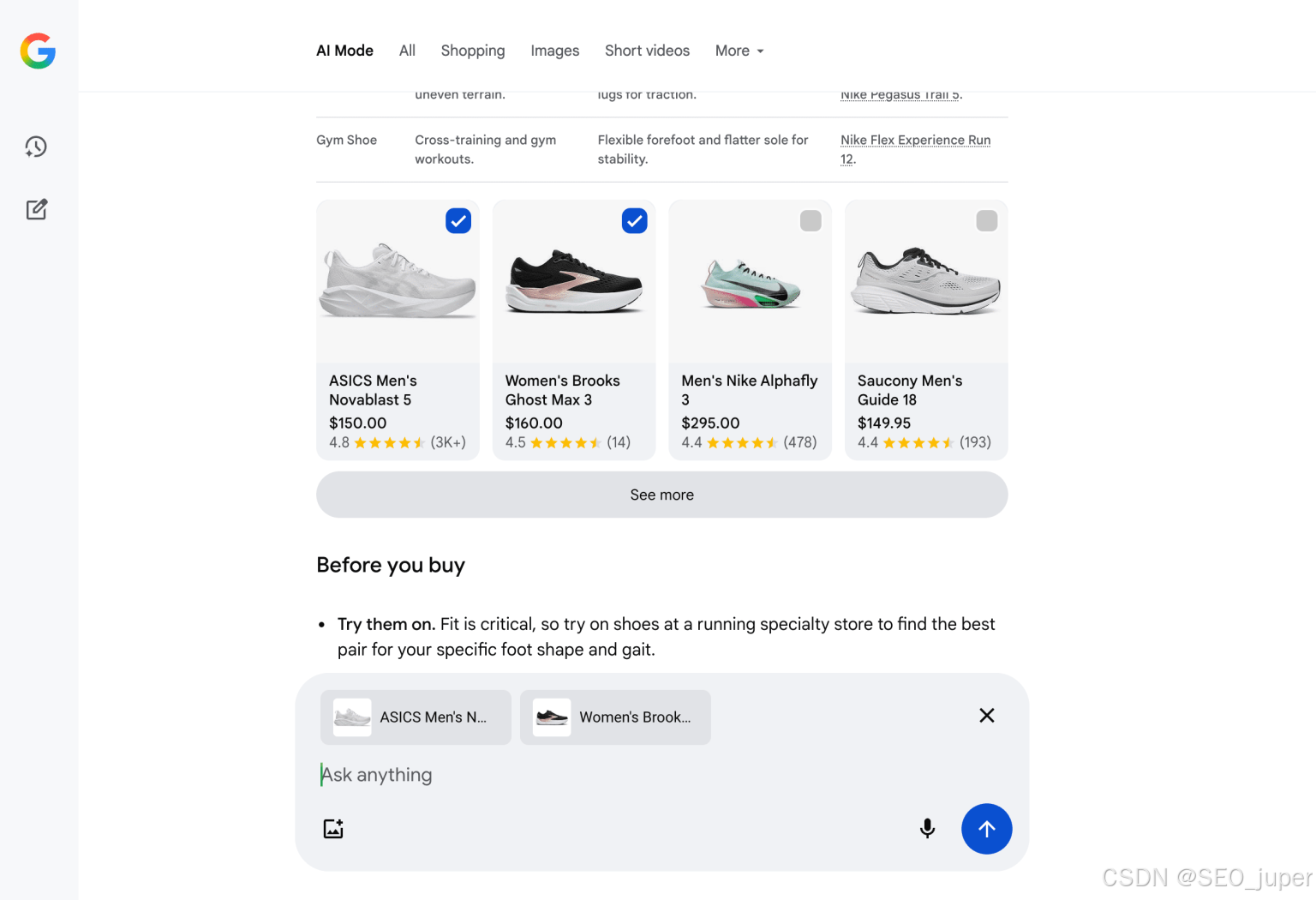 此外,谷歌还扩展了AI模式,新增了“询问任何商品”功能,引入对话框,通过勾选单个商品引导用户比较产品或本地商品。