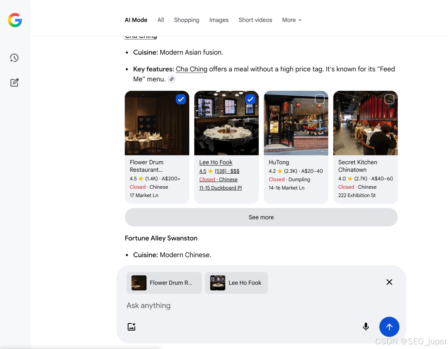 此外,AI模式现在可以根据你的兴趣定制结果。它可以利用你之前的对话和搜索过的地点,提供更相关、更个性化的选项。例如,如果你偏好意大利菜、植物性餐点或户外座位,搜索结果会突出显示符合你偏好的场所。