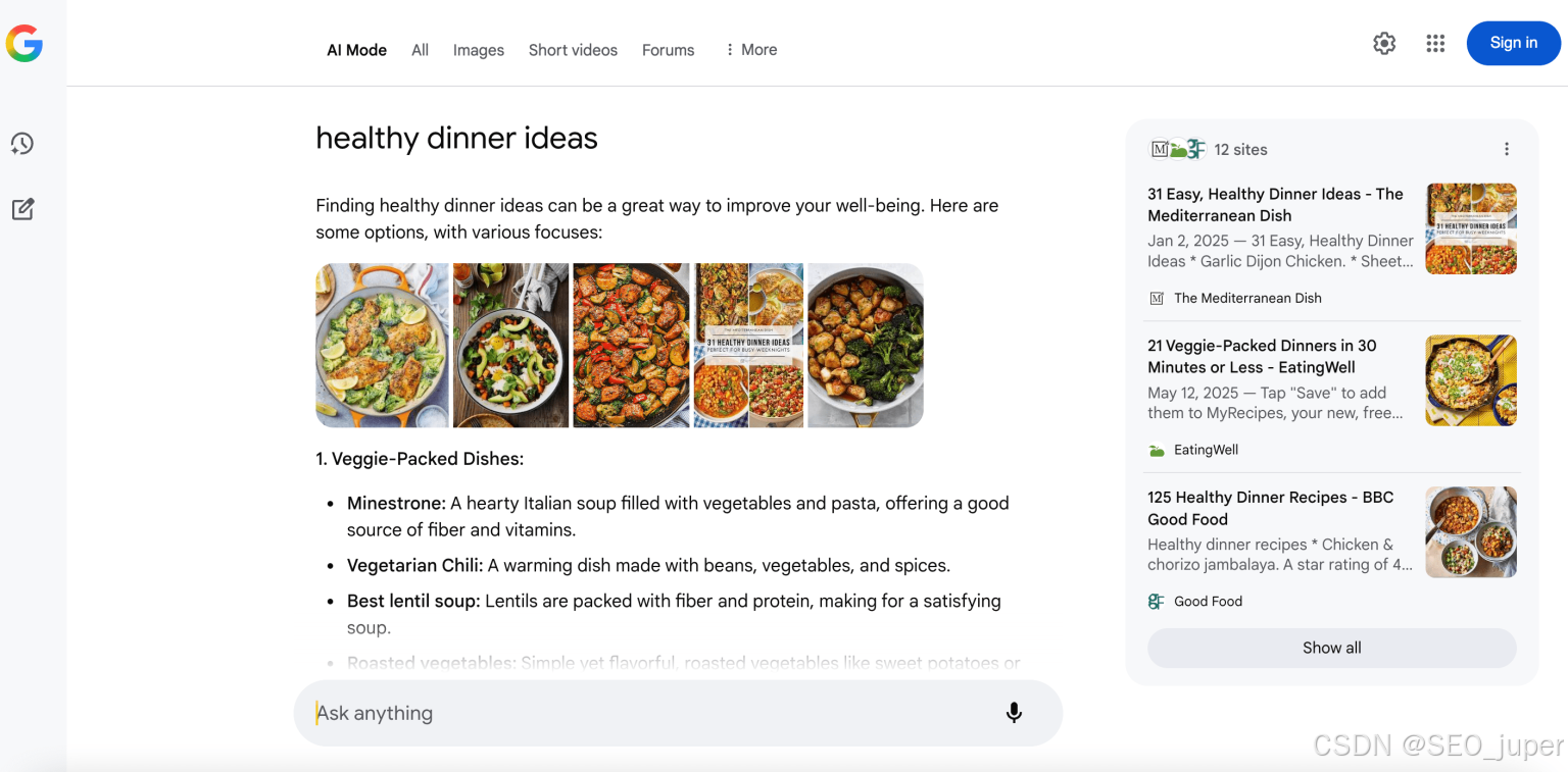 AI模式专为开放式、探索性问题设计,尤其是那些常规搜索结果无法充分回答的问题。这包括寻求建议、比较等。