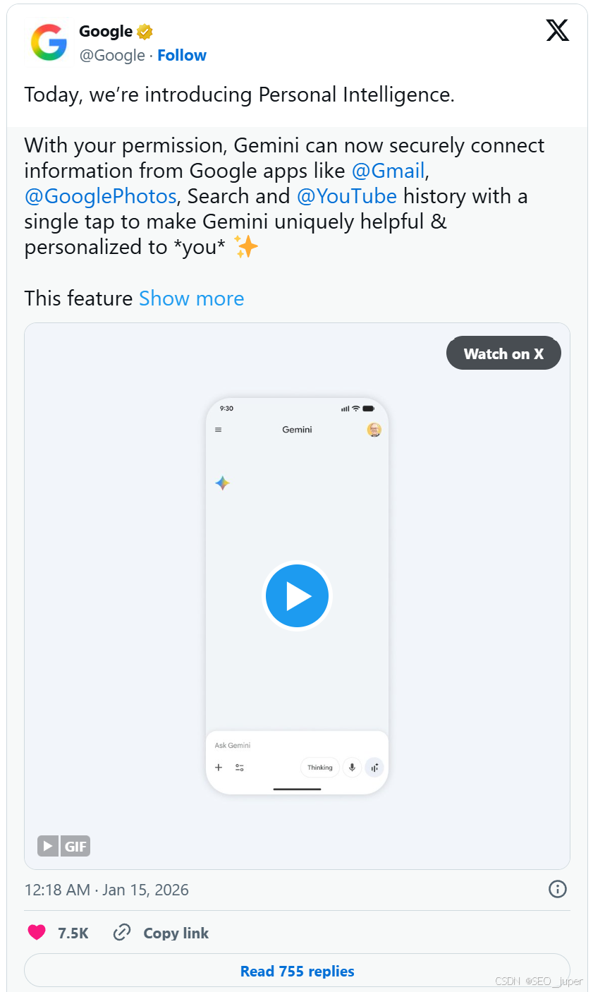 谷歌随后在Gemini应用中引入了个人智能,这是一个测试版功能,可以连接Gmail、照片、YouTube和搜索等服务,通过从用户自身内容中获取洞察,生成更个性化的回复。
