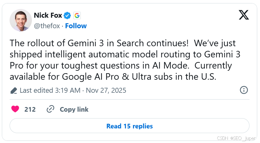 接下来谷歌宣布将驱动Gemini 3,支持搜索的AI模式。