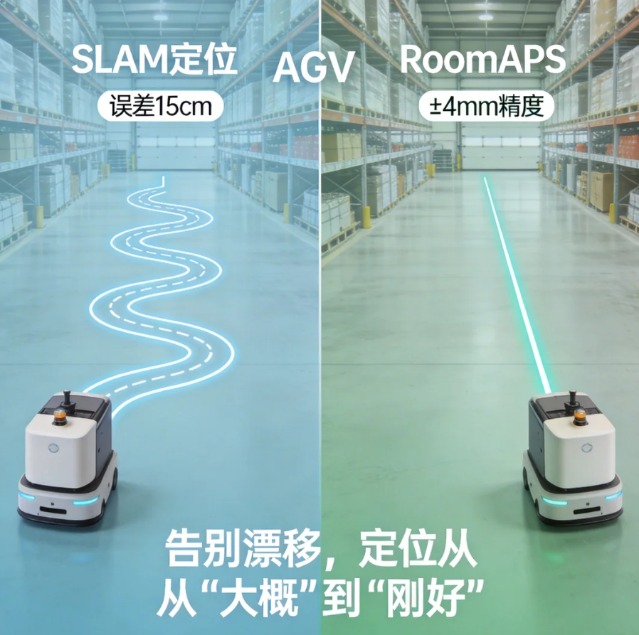这一逻辑在户外已成熟应用——RTK-GPS与惯性导航的组合,让自动驾驶汽车在长距离行驶中不偏航。而在室内,直到毫米级绝对定位系统(如RoomAPS)的出现,才让类似方案成为可能。