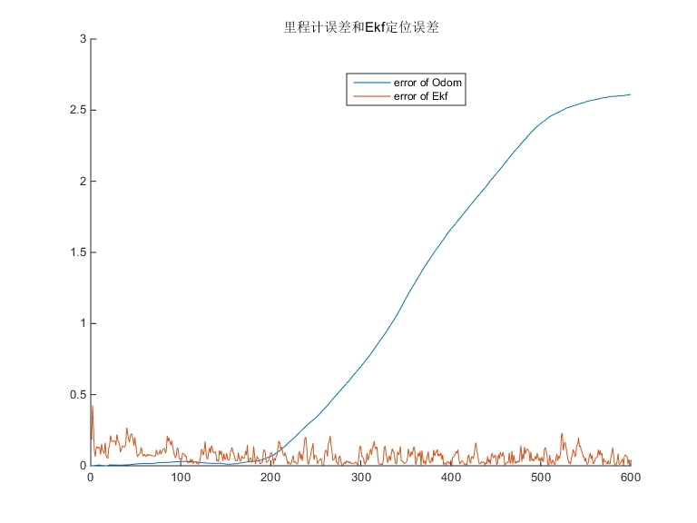 errorEkfaverage = 0.071629。EKF通过融合里程计和GPS数据,能够有效抑制噪声和误差的累积,从而保持较低的定位误差。