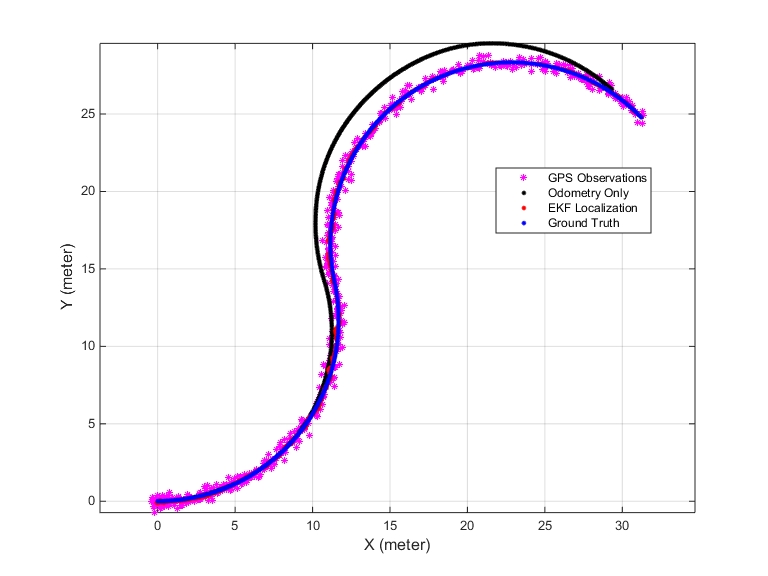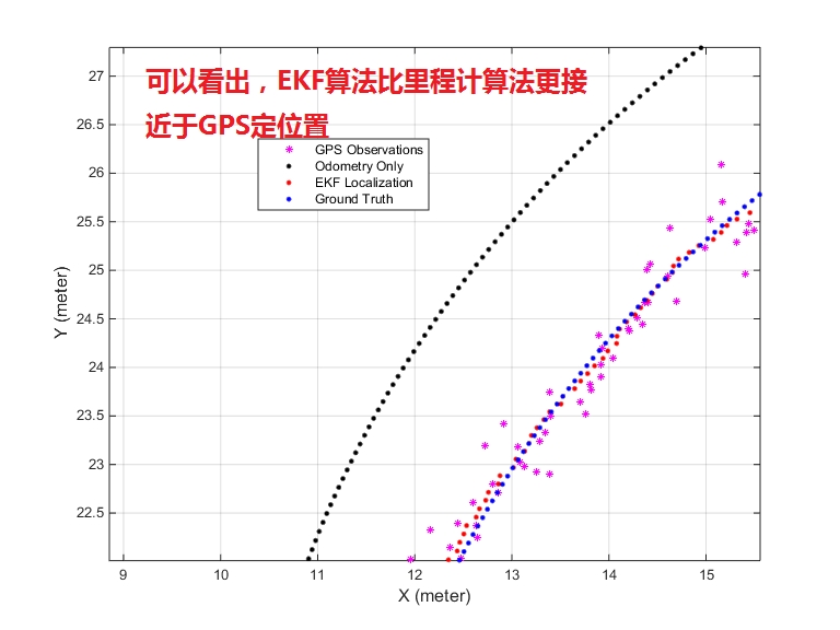 下面是一个简单的MATLAB程序,展示了如何利用EKF和里程计模型对机器人进行定位,并与GPS的真实值进行比较: