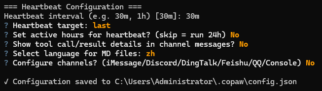 交互式初始化(按提示填写心跳间隔、投递目标、活跃时段,并可顺带配置频道与 Skills):