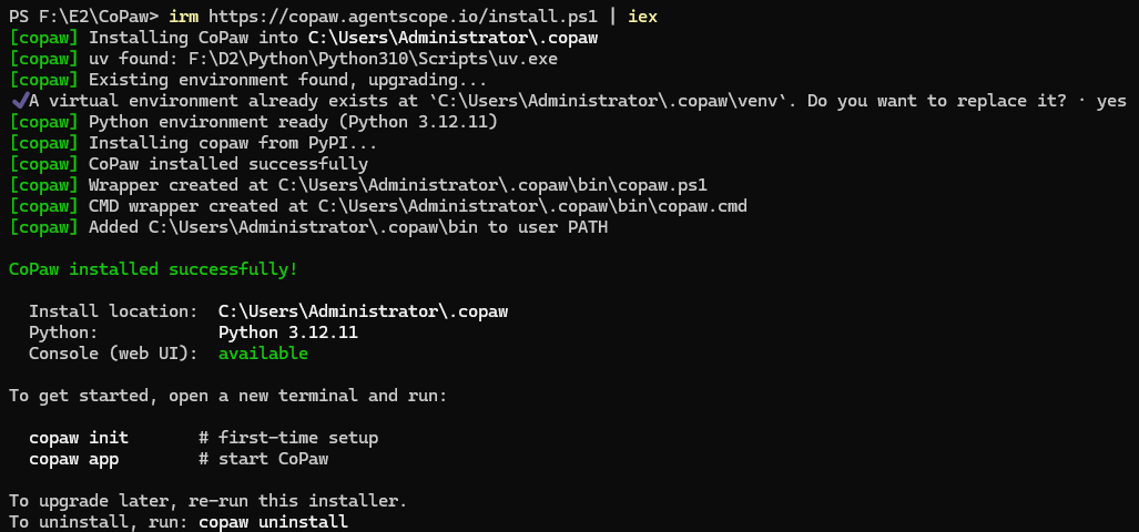 irm https://copaw.agentscope.io/install.ps1 | iex