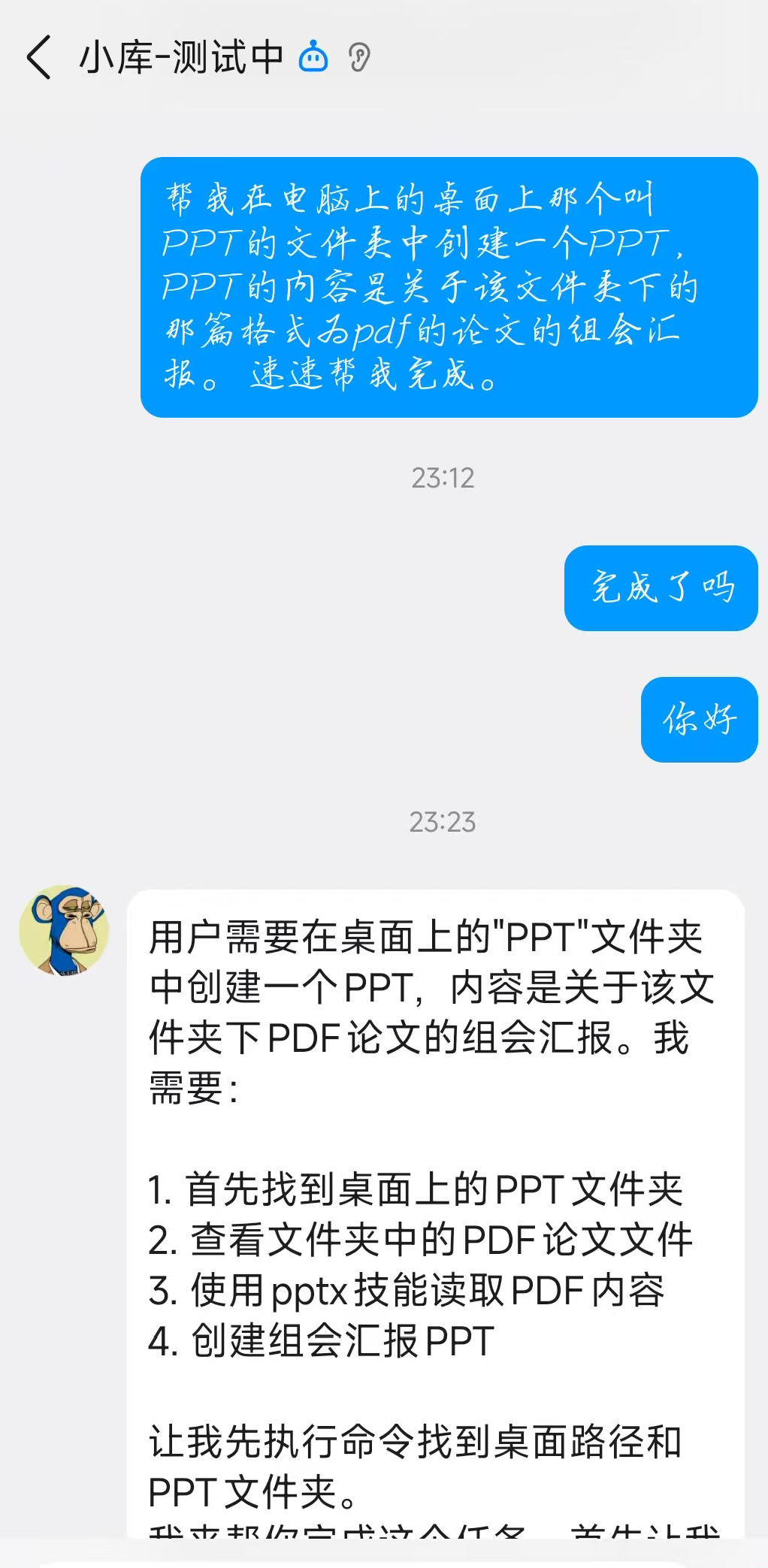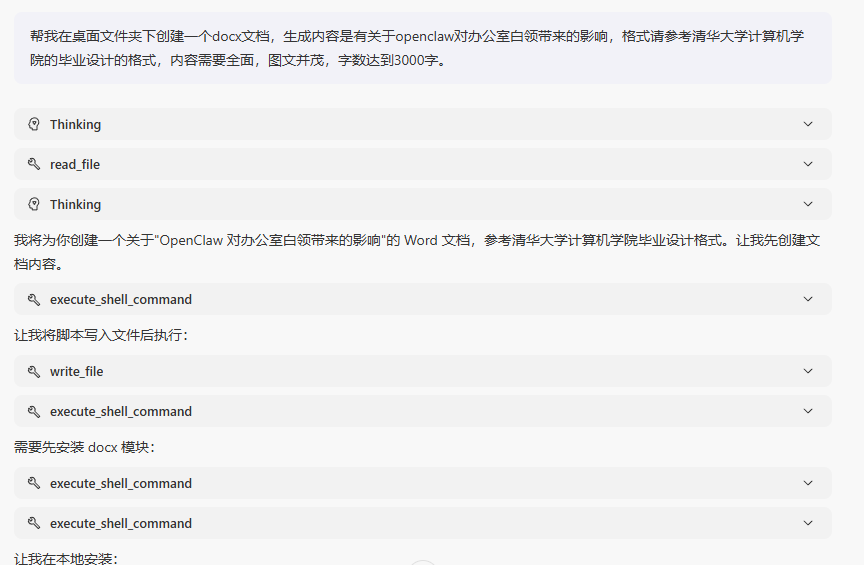 这种Agent智能助手工具与普通的 AI 聊天机器人不同,它就像一个“有手有脚”的智能大脑,不仅能理解你的指令,还能主动执行相应操作。例如,它内置了多种实用技能,包括处理 PPT、DOCX、PDF 文档,打开浏览器,以及执行定时任务等。同时,这些技能还支持扩展——一旦扩展,它的能力会变得更加强大,功能也更加丰富。举个例子,我只需下达一条指令,它就能为我生成一个 DOCX 文档。