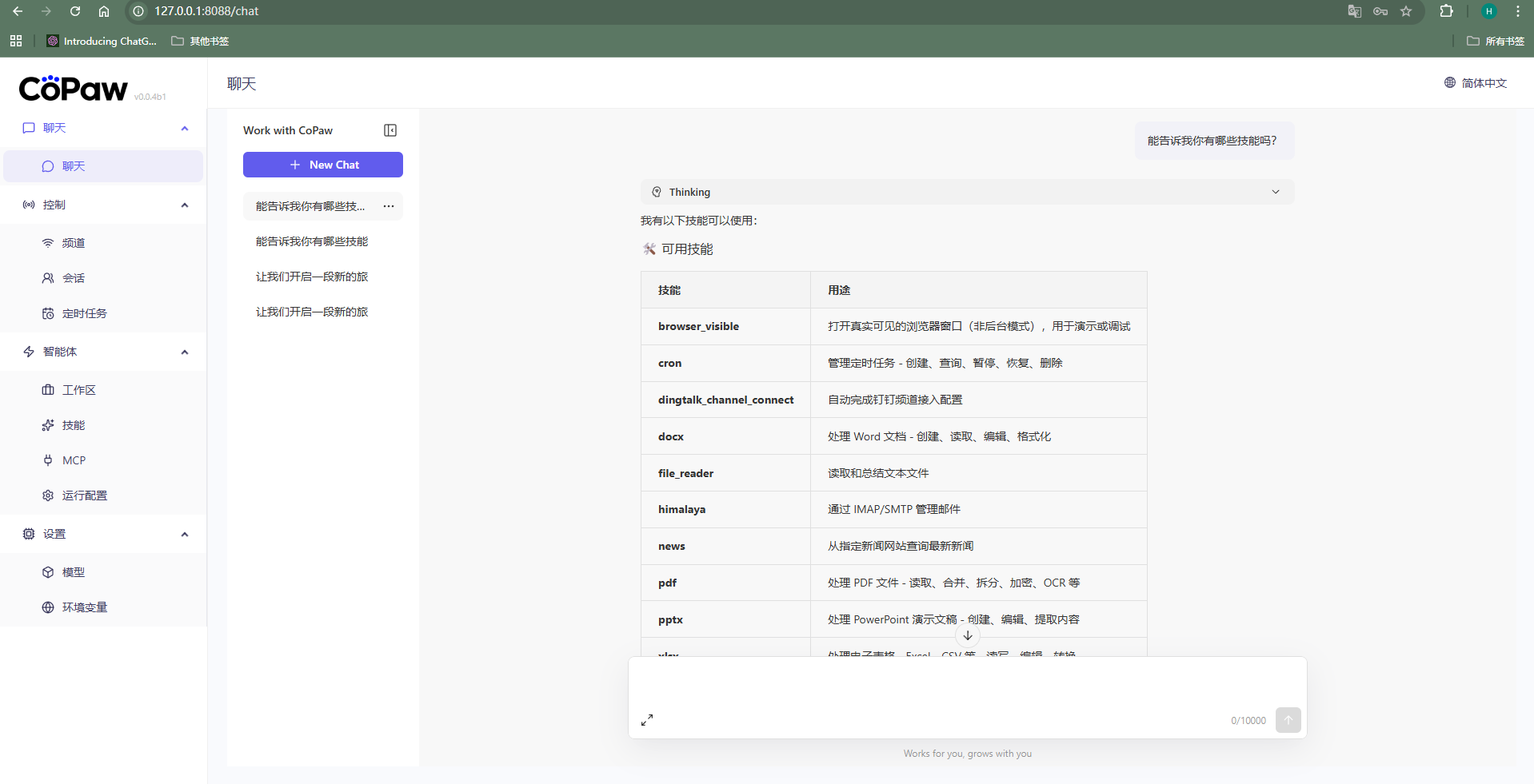 在这个图形化界面可以对 CoPaw 进行一些基础的配置,然后还可以像平时用的AIChat工具一样对它进行提问。
