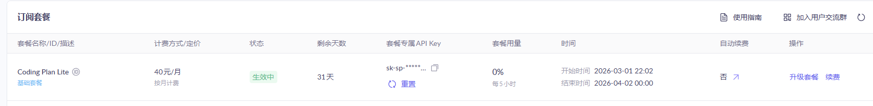 这一步大模型的配置需要大家去阿里云百炼平台购买一个 7.9 的新人套餐,然后配置自己的api-key,当然如果不想要阿里云百炼的大模型,也可以配置其他厂商的,但是似乎不支持 GLM 家的。