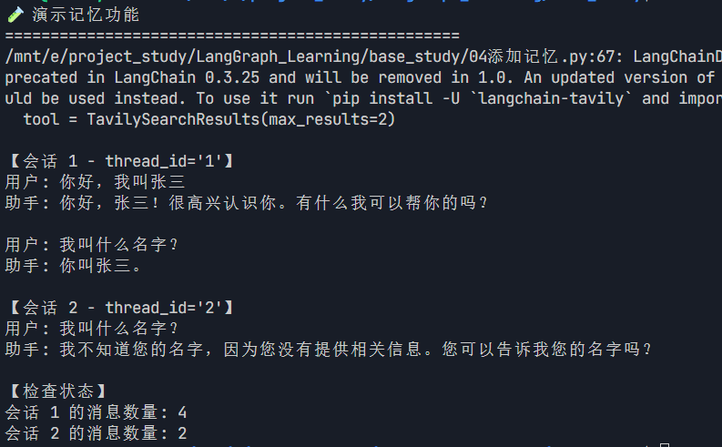 展示同一个 thread_id 能记住上下文,不同 thread_id 无法共享记忆。