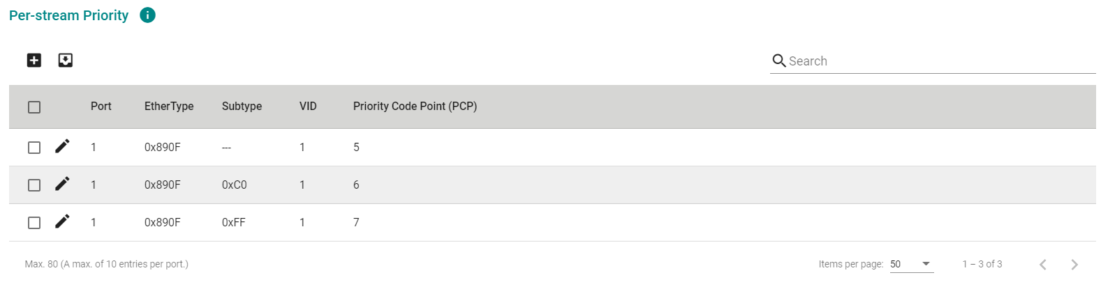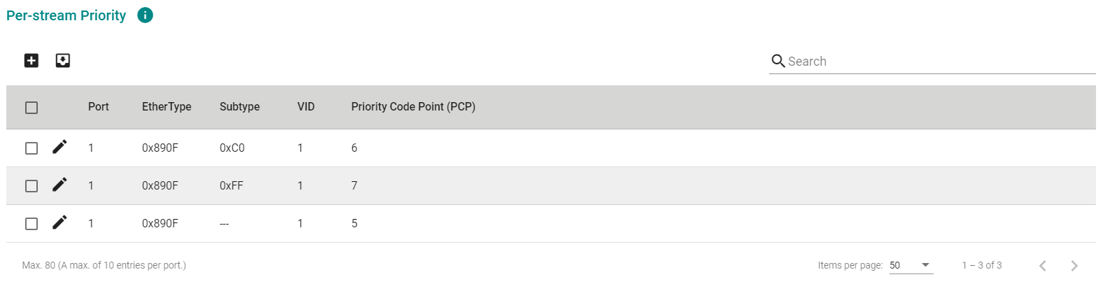 TSN交换机会根据流优先级表中各流优先级列表的条目顺序(自上而下)来检查数据包。例如:在案例1中,以太网类型为0x890F且子类型为0xC0/0xFF的数据包将被视为符合第一条优先级,而非第二条或第三条。