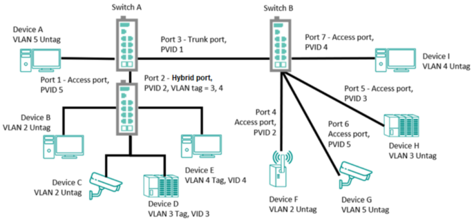 - 来自设备A的数据包将通过标记VID 5的中继端口3传输。交换机B识别其VLAN后,将数据包转发至端口6,随后移除设备G成功接收的标签,反之亦然。