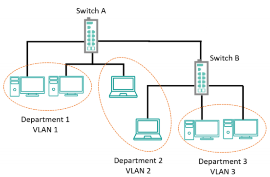 - 部门级划分——可分别为营销部、财务部、产品开发部设置独立VLAN;