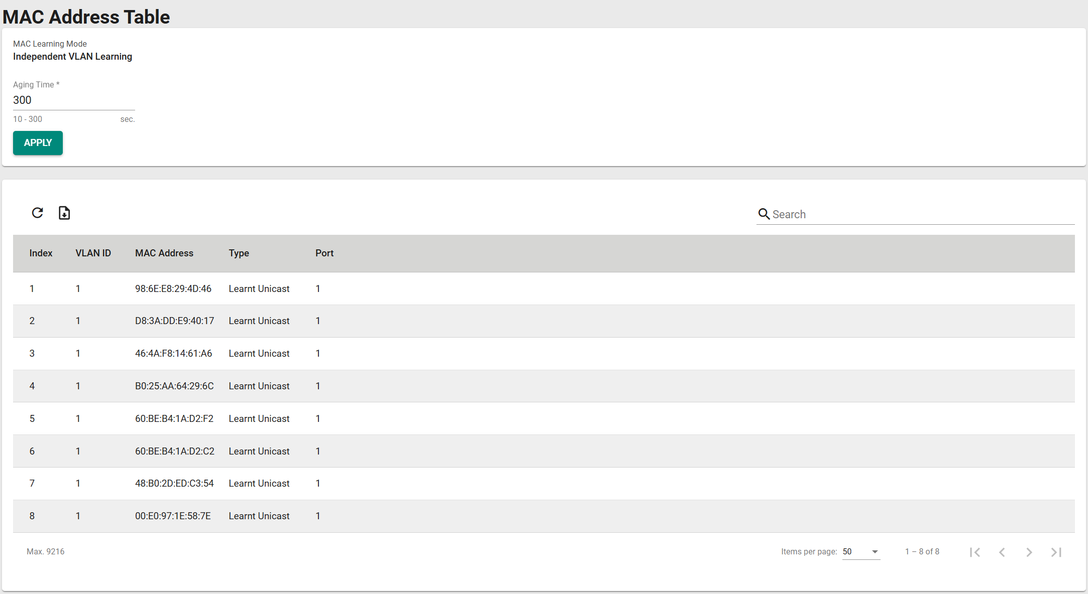 在配置页面底部查看当前MAC地址表