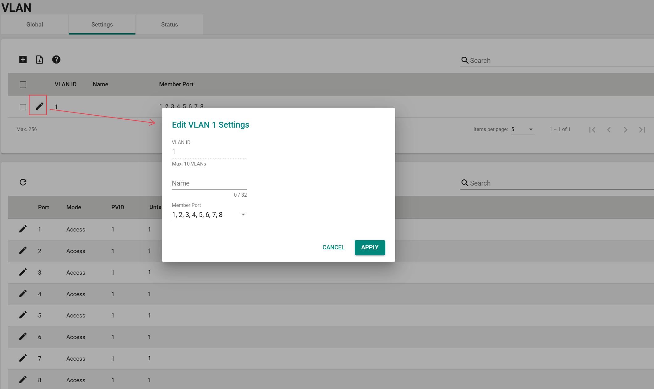 - 该字段仅在选择混合端口类型时生效。请为连接到该端口的标记设备设置其他VLAN ID,并在出站数据包中移除需要删除的标签。使用逗号分隔不同VID (1 to 4094)
