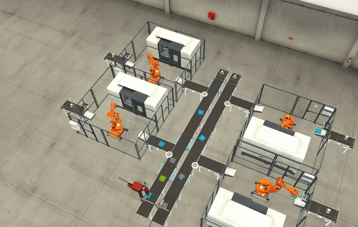 这个程序主要应用在这样一个场景中:四台加工中心(这里的机器人可不是真家伙,只是仿真软件FactoryIO里的一个部件罢了)开启工作模式。它们加工好的零件呢,会通过皮带输送到机械手那儿进行组装。这里的机械手逻辑效率超高,同时皮带还具备防堵、避让、分流等一系列厉害的功能。