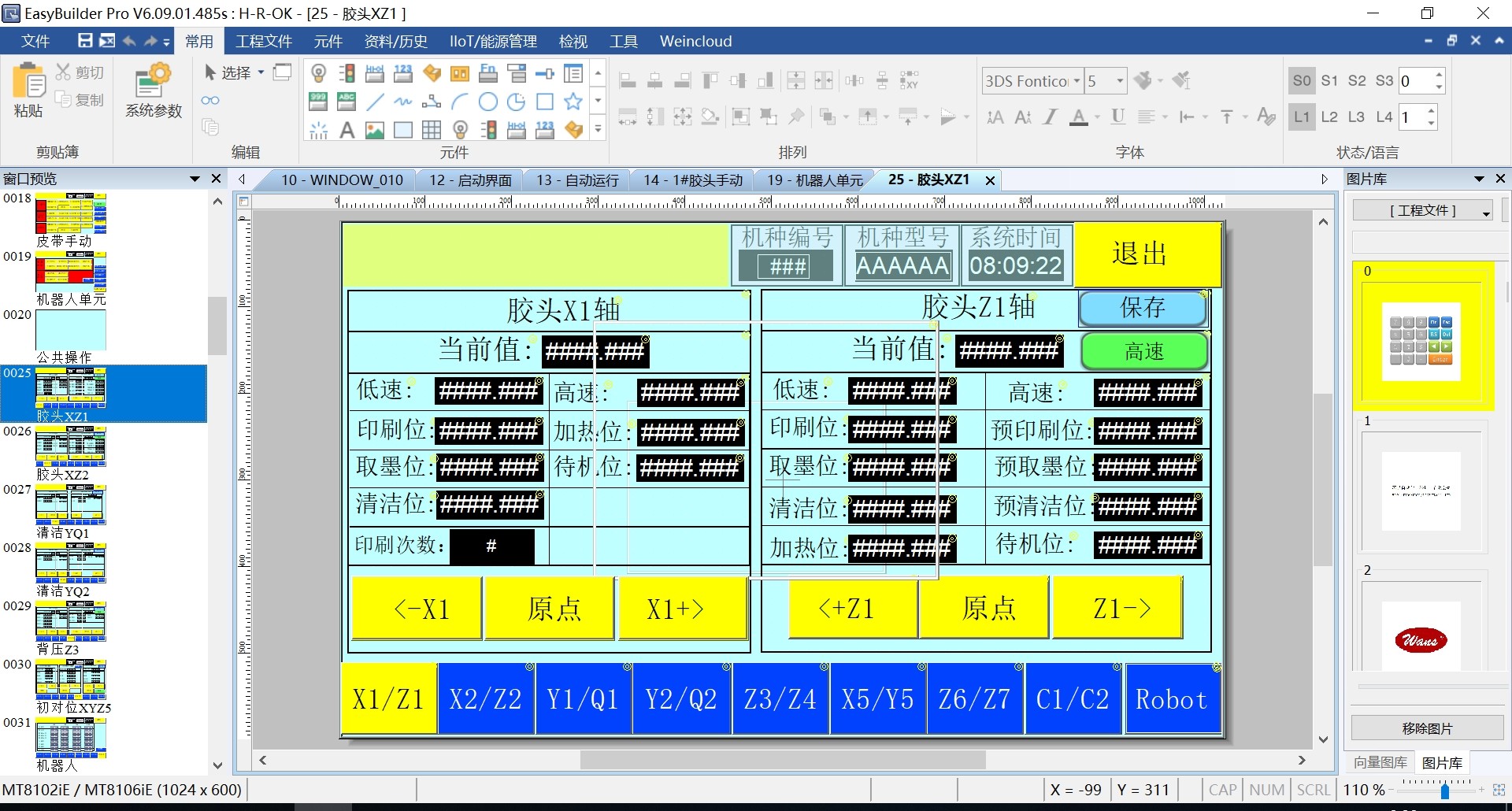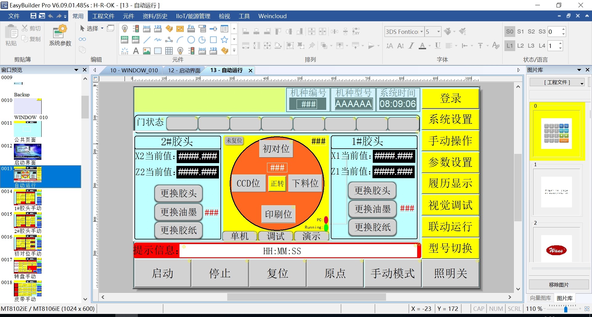 LOGO印刷机,松下FP7 PLC程序 松下FP7+定位模块,控制DD马达多工位转盘加工控制,松下伺服,转盘四工位程序。 带ProEasy系列机器人程序,可以用lua打开。 机器人示教集成到触摸屏。 包含自动上料位,CCD照位,印刷位,下料位,四工位转盘加工模式。