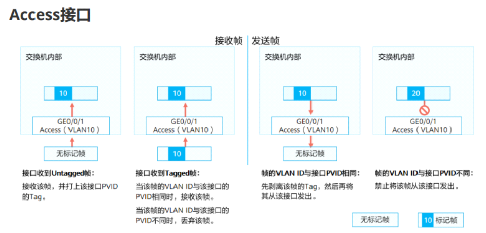 接收带标记帧(Tagged 帧):检查该帧的 VLAN ID 是否在接口允许通过的 VLAN 列表中,在列表中则接收该帧,否则直接丢弃。