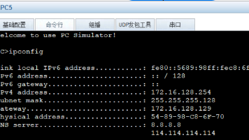 - 最后就在pc端点击DHCP 输入ipconfig查看IP信息