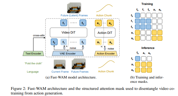 - 提出 Fast-WAM 架构,训练阶段保留视频协同训练,测试阶段移除未来预测,实现实时推理。