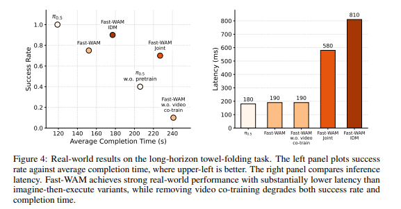 我们在长时域真实世界毛巾折叠任务上进一步评估 Fast-WAM,同时报告平均成功率和平均完成时间(两者同等重要)。结果如图 4 所示。
